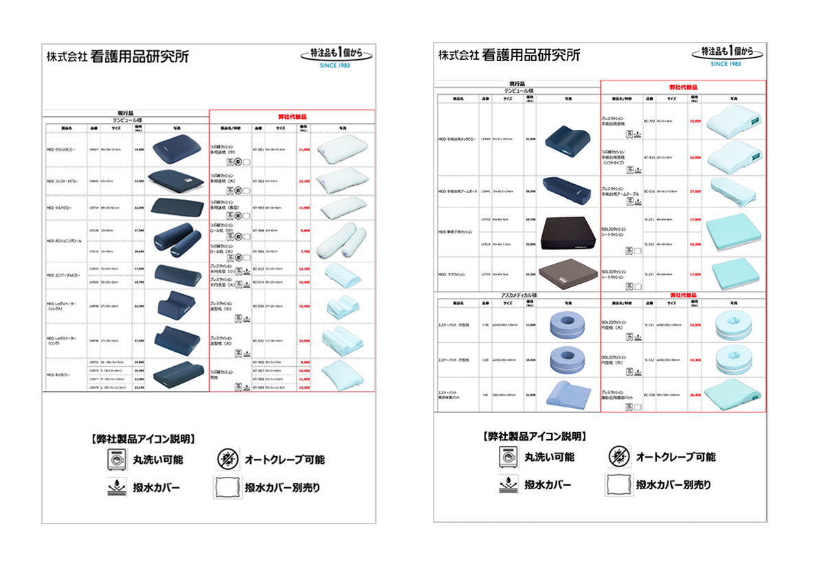 特注事例 愛媛県 大学病院様のご要望 こちらからダウンロードできます→ 困りごと これまで使用していた他社製クッションが廃番になってしまった 新たに買い替えたいが、同じサイズのものが無い 現場様でのニーズ 既存品と同じ形状、サイズを継続使用したい 新たに買い替える際に同じサイズを同様の価格で買いたい 当社の特注対応 他社廃番対象品リストを確認し、同様のサイズのクッションを製作 既存品を下回る価格にて提供 既存品と同等製品の使用が可能に!